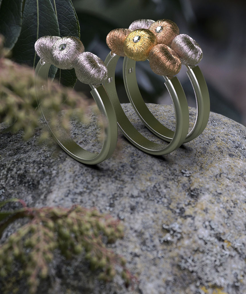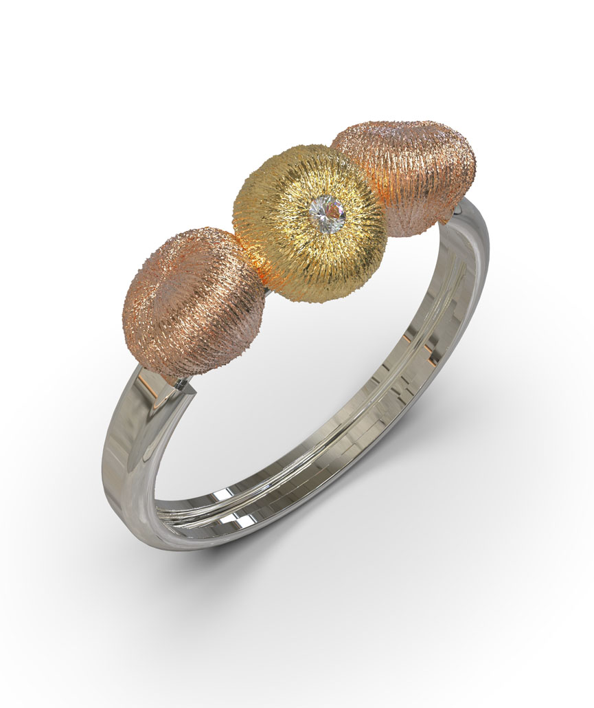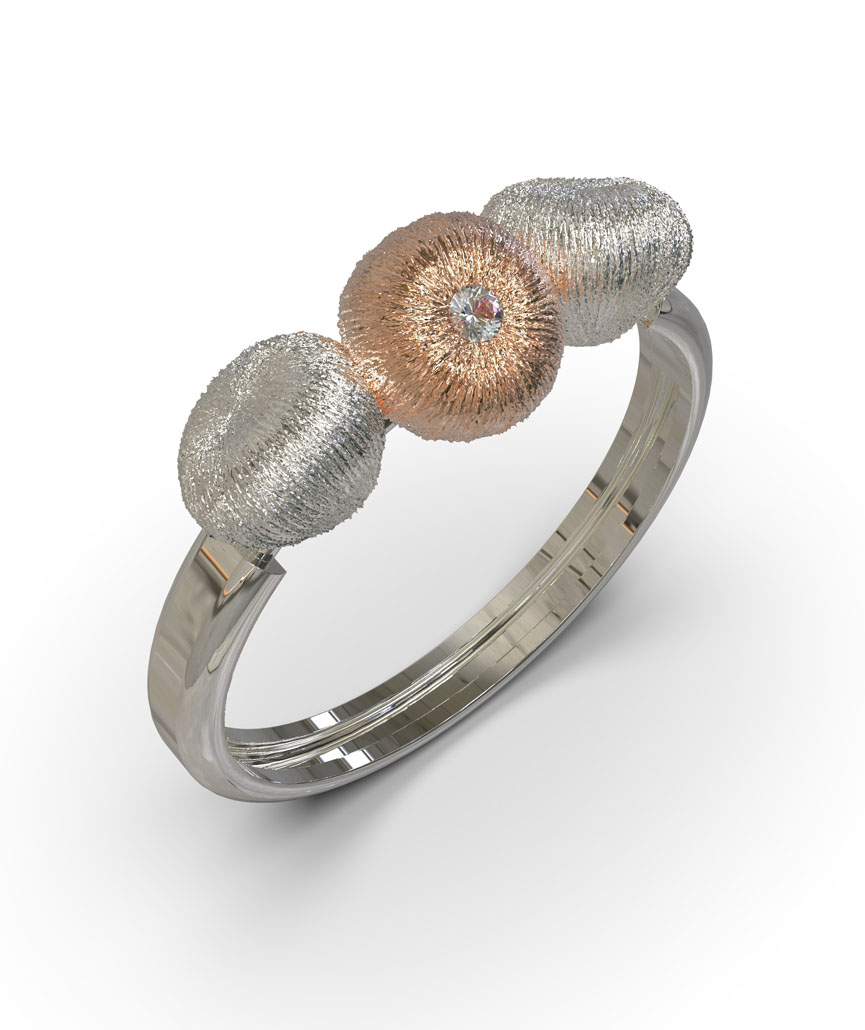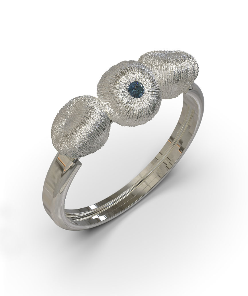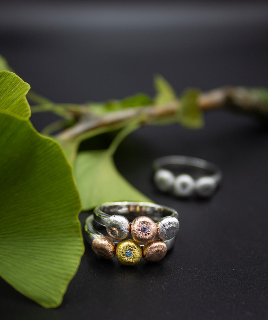 Silver ring and mobile beads in various 18kt plating colors. Central bead with a blue or London blue topaz.