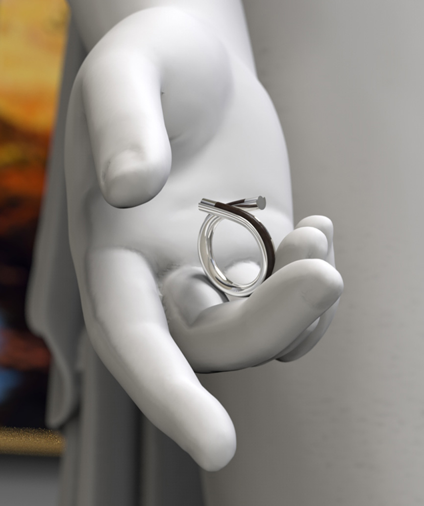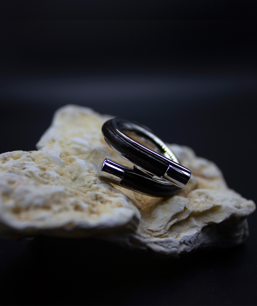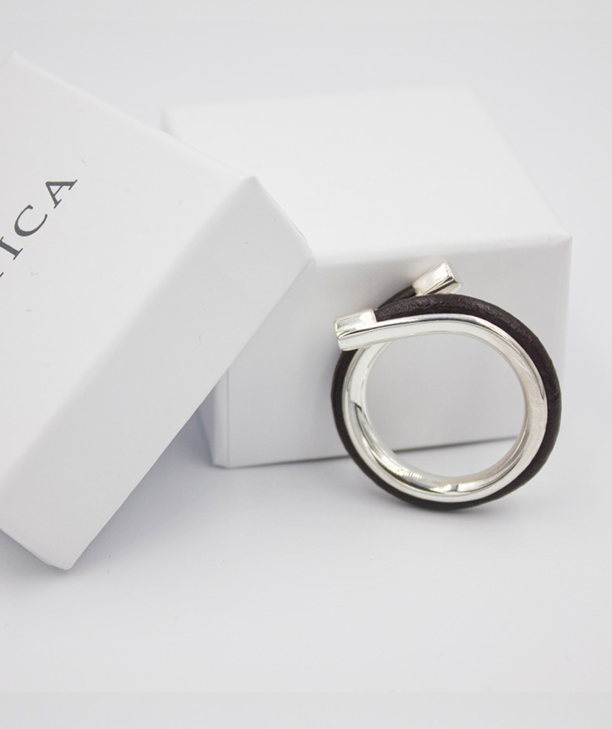 Unisex Silver ring with embedded recycled natural leather twisted in essential and elegant design lines